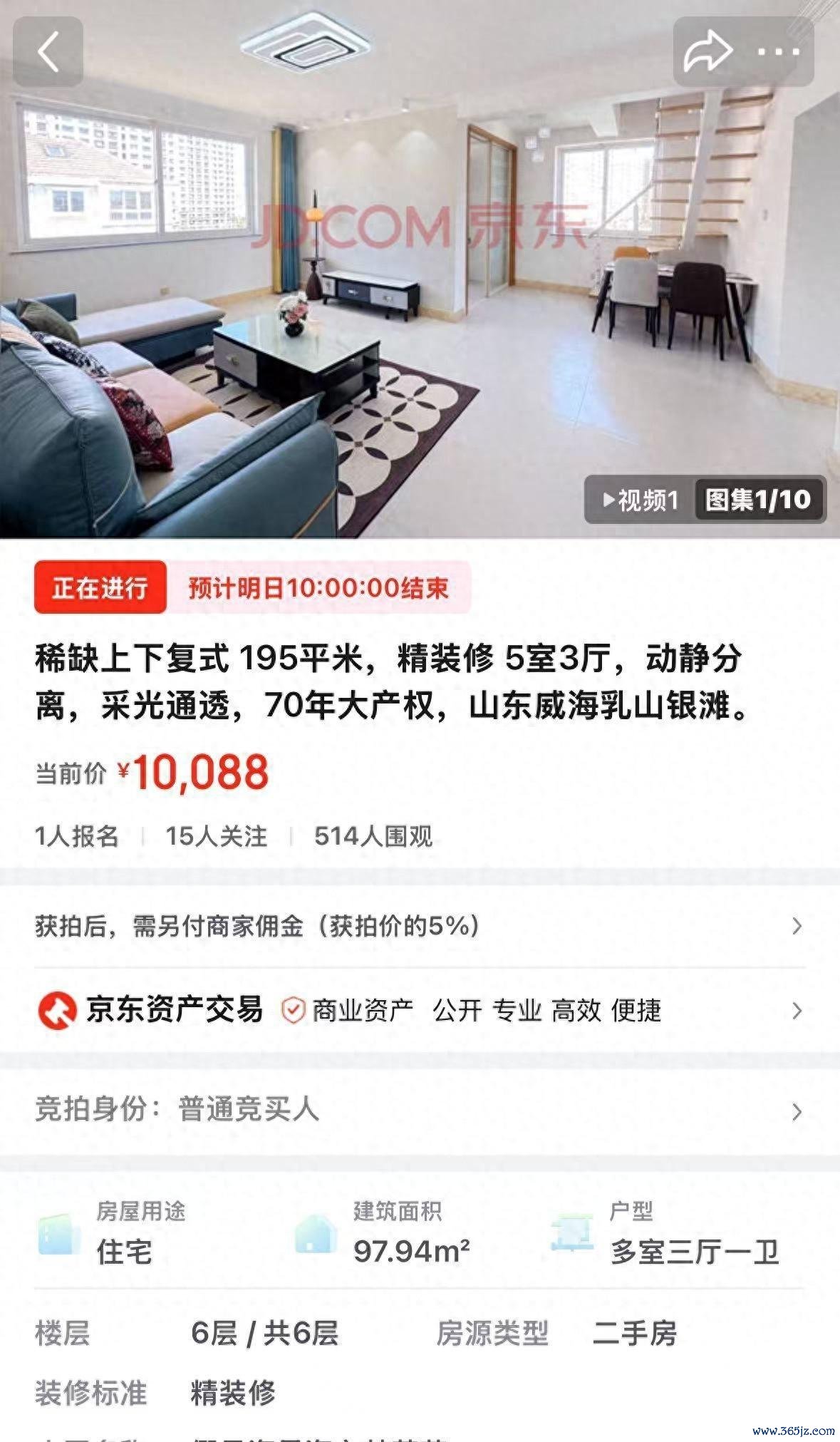 最近乳山银滩一套标着“195㎡复式”的房子在京东拍卖上火了。起拍价10088元,最后叫到15688元,好几个人抢着加价,评论区全是“真能1万买房?”“复式送一百多平?”“这不比鹤岗还狠?”我连刷三天,越看越迷糊,干脆把拍卖页、不动产权证截图、中介聊天记录全存下来,挨个对。
